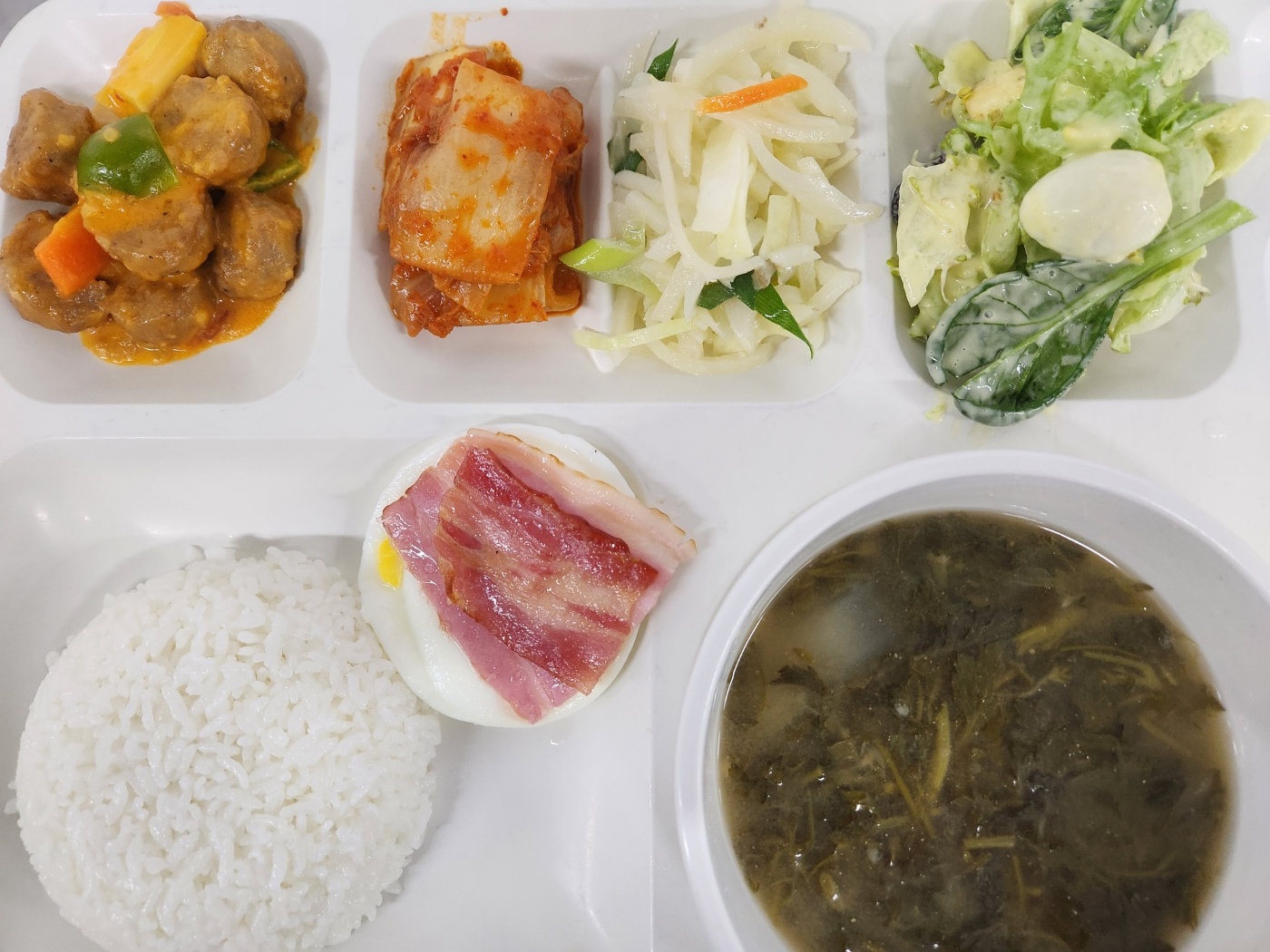 | 달걀후라이&베이컨(돈수입)/시저샐럿/볶은김치 |