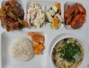 쌀 – 국내산 (현미, 찹쌀포함)/ 김치 – 배추김치 :국내산,고추가루:국내산 / 쇠고기 -국내산 ,닭고기 – 국내산 (훈제포함)/ 오리 – 국내산 (훈제포함)/ 돼지고기 – 국내산(등뼈,갈비,전지,후지,사태) 수산 – 삼치,고등어,굴비 (국내산)/오징어(국산,원양산)/ 명태,코다리(러시아산)/ 꽁치 (원양산)/낙지 (베트남산,중국산)/ 꽃게 (국내산) 날치알 (수입산), 새우살(수입산)/ 진미채 (페루산), 쥐채(원양산)/ 갈치(세네갈,모로코산)/ 가자미(수입산) 참치캔(원양산)/ 가쓰오브시(인도네시아산) 콩 – 팩두부 (수입산)/ 연두부 ,순두부 (국내산)/어묵-연육(수입산)/도토리묵가루-(수입산) *시장 수급에 따라 메뉴는 변동될수 있습니다. |