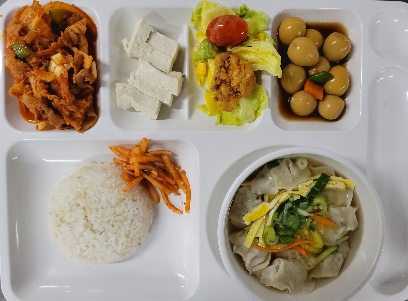 고추군만두/느타리베이컨볶음(돈육수입산)/김치 |