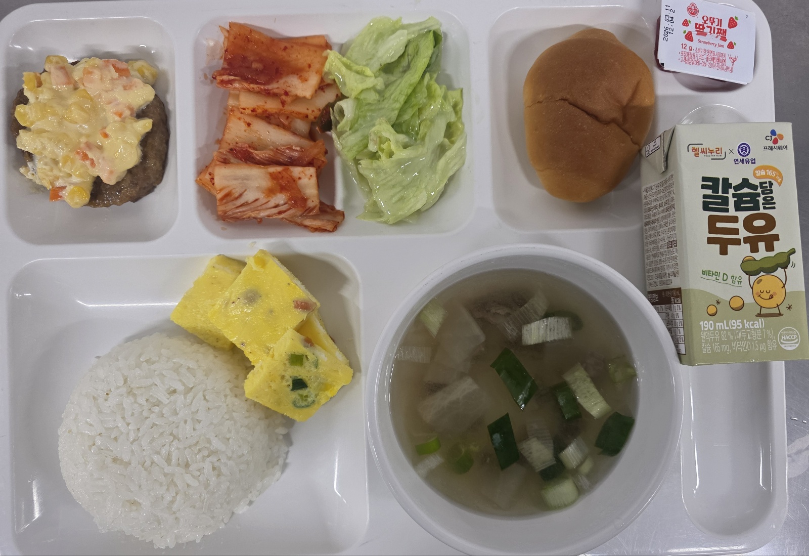 야채샐러드/모닝빵&딸기쨈/두유/김치 |